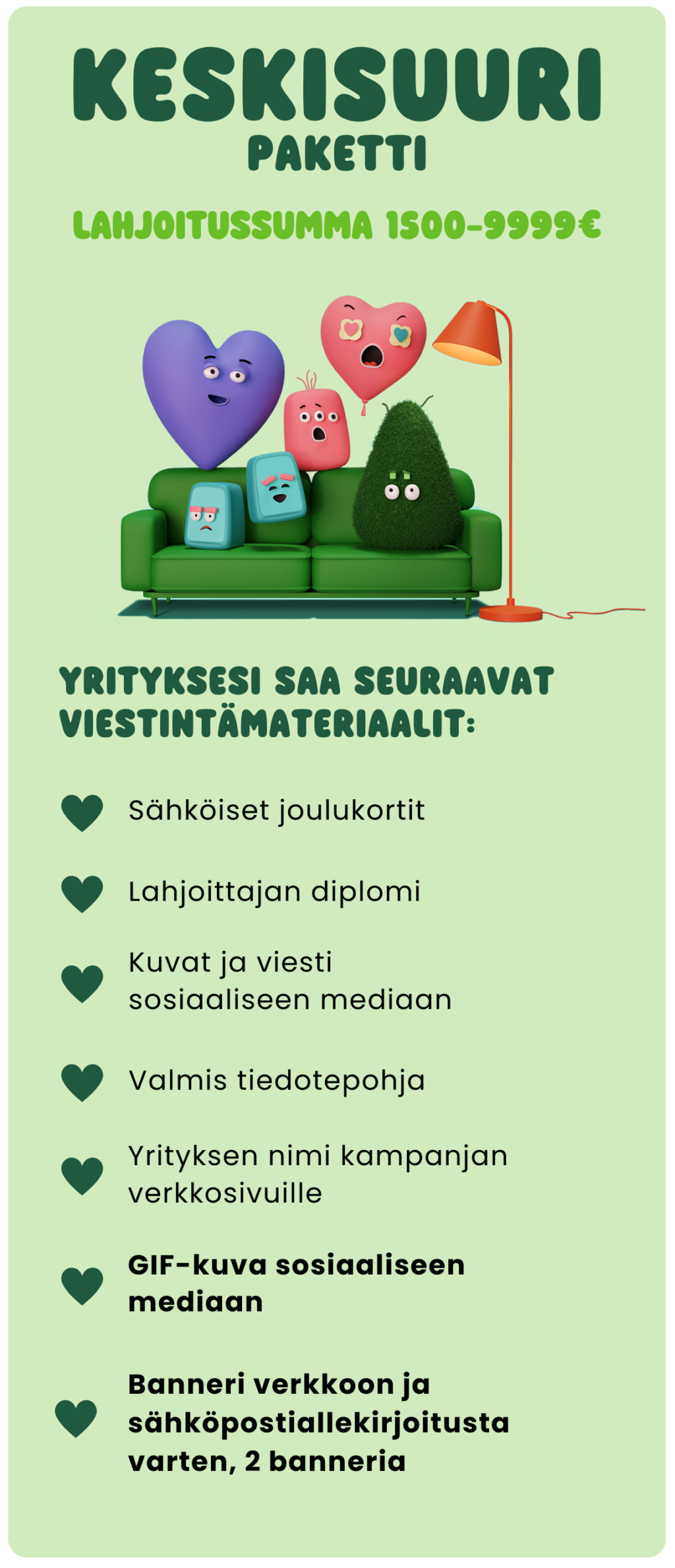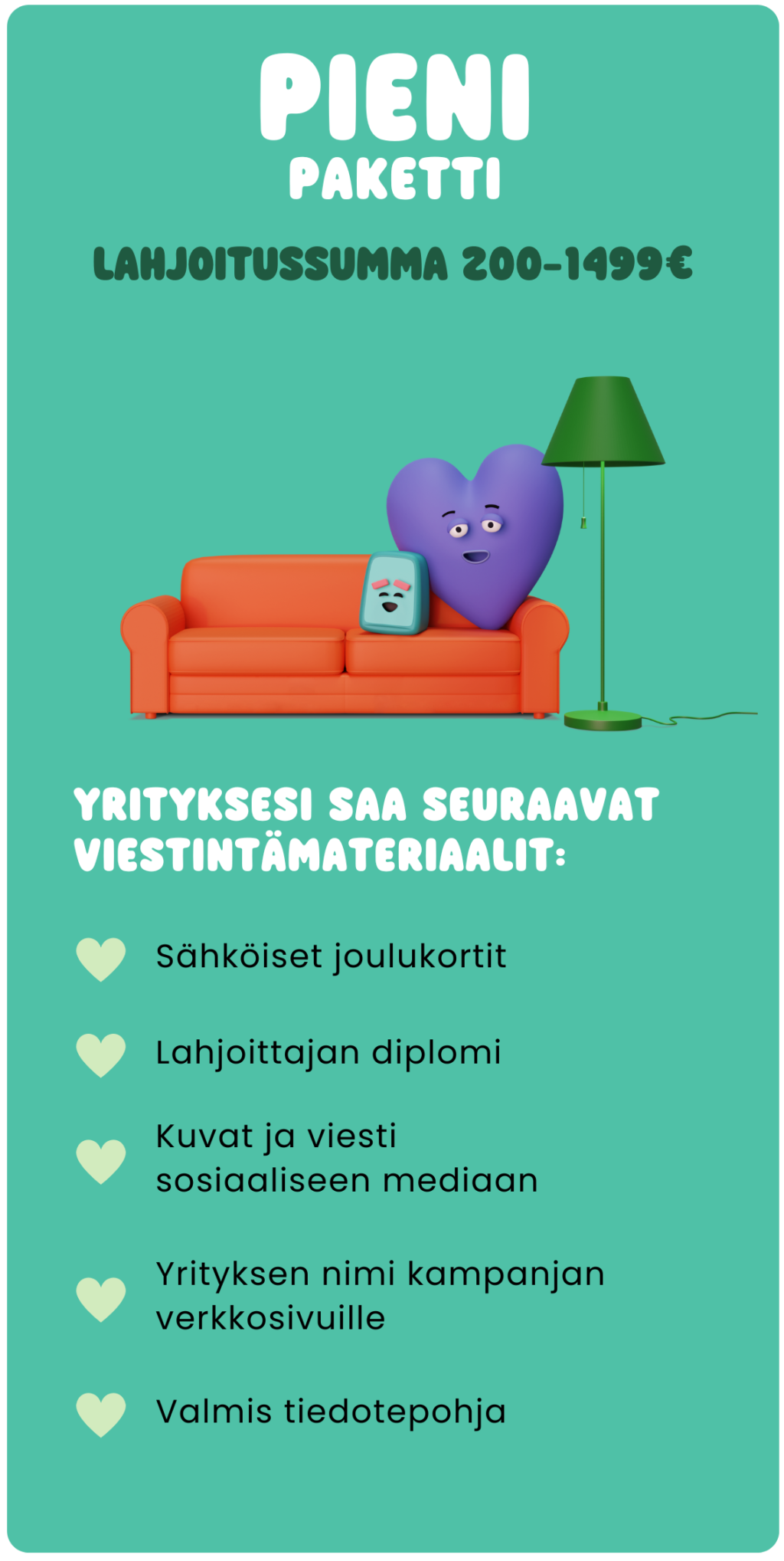 Yrityslahjoittajana saatte kiitokseksi kauniit viestintämateriaalit. Lue lisää ja tutustu yrityslahjoittajien viestintäpaketteihin lahjoituslomakkeen alapuolella.