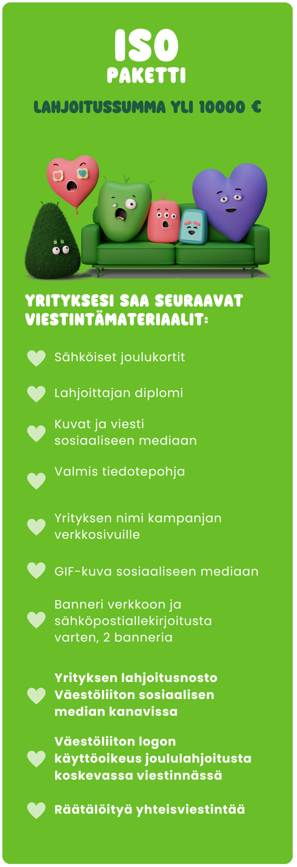 Yrityslahjoittajana saatte kiitokseksi kauniit viestintämateriaalit, joilla voitte viestiä tuestanne ja välittää joulutervehdykset sidosryhmillenne.